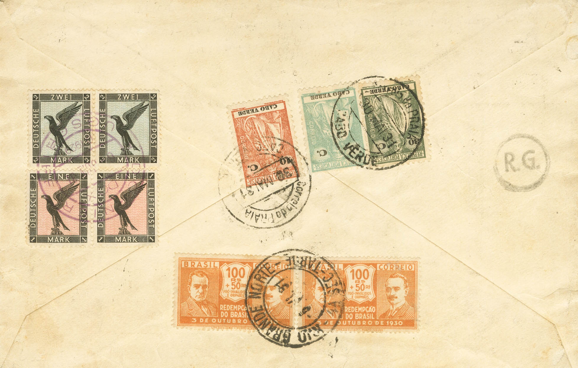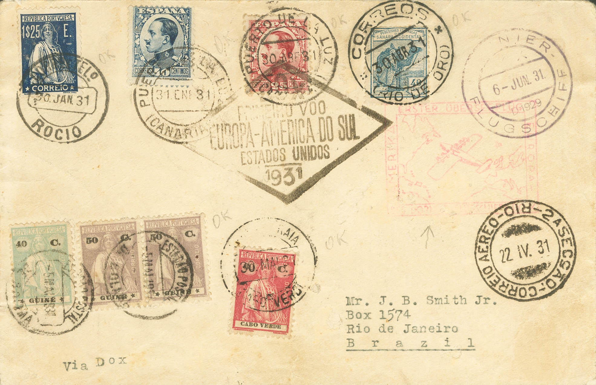 7. 1931. 40 cts azul y franqueo diverso de Sahara, Portugal, Guinea, Cabo Verde, Alemania y Brasil. Carta Circulada desde RIO DE ORO a través de Cabo Verde, Guinea, Portugal, España y Alemania, a bordo del avión DORNIER X, en su primer vuelo entre Europa y América del Sur. Matasello DOX / PRIMEIRO V00 / EUROPA-AMERICA DO SUL / ESTADOS UNIDOS / 1931, en negro y al dorso llegada a Río de Janeiro con dos sellos de Brasil de 100 Reis naranja. MAGNIFICA Y RARISIMA.