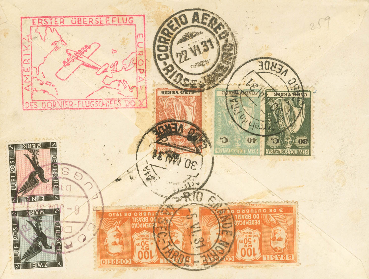 7. 1931. 40 cts azul y franqueo diverso de Sahara, Portugal, Guinea, Cabo Verde, Alemania y Brasil. Carta Circulada desde RIO DE ORO a través de Cabo Verde, Guinea, Portugal, España y Alemania, a bordo del avión DORNIER X, en su primer vuelo entre Europa y América del Sur. Matasello DOX / PRIMEIRO V00 / EUROPA-AMERICA DO SUL / ESTADOS UNIDOS / 1931, en negro y al dorso llegada a Río de Janeiro con dos sellos de Brasil de 100 Reis naranja. MAGNIFICA Y RARISIMA.