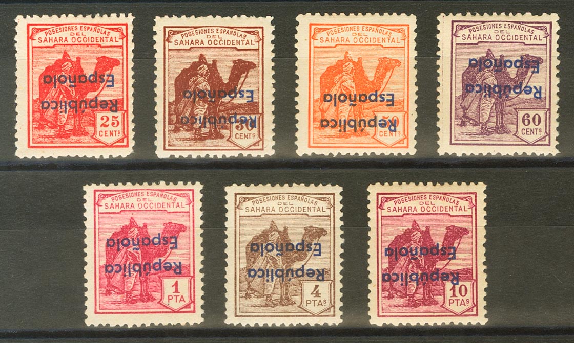★ 40/41Bhi, 43/47Bhi. 1932. 25 cts, 30 cts, 50 cts, 60 cts, 1 pts, 4 pts y 10 pts. SOBRECARGA INVERTIDA. MAGNIFICOS. Edifil 2018: 589 Euros