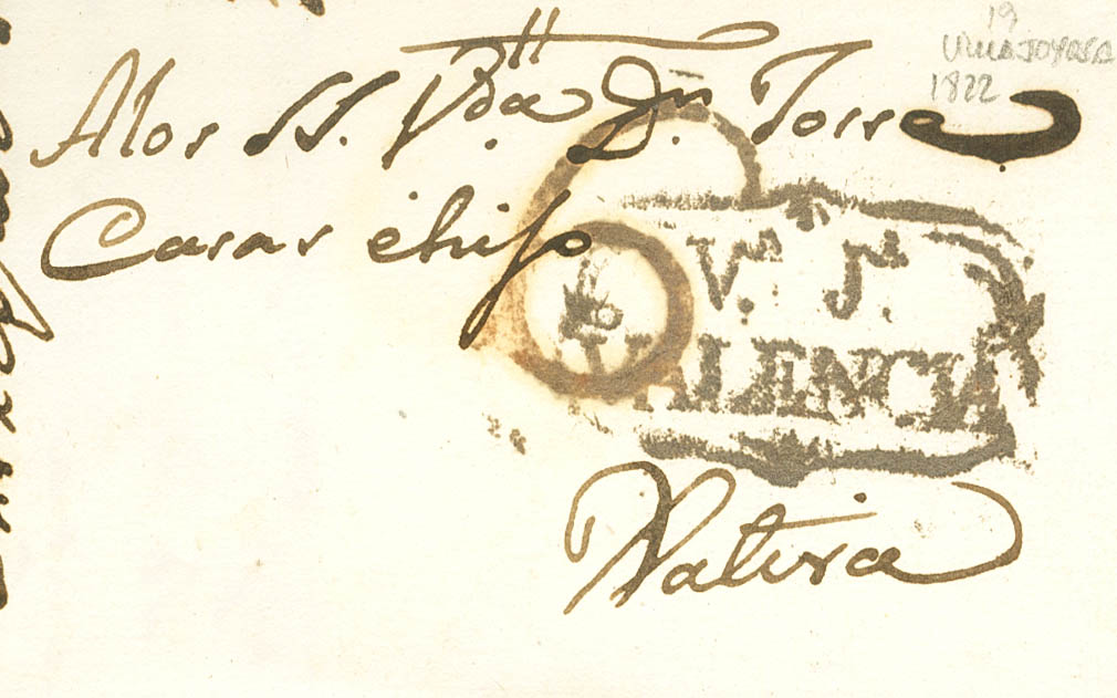 1822. VILLAJOYOSA a JATIVA (VALENCIA). Marca VªJª / VALENCIA, en rojo muy oxidado (P.E.2) edición 2004. MAGNIFICA.