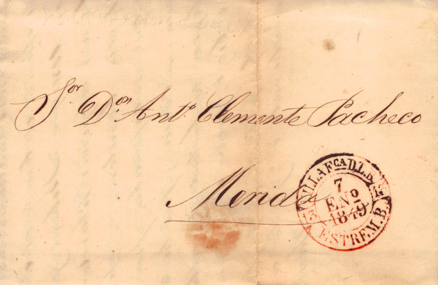 1849. VILLAFRANCA DE LOS BARROS (BADAJOZ) a MERIDA. Baeza VILLAFCª D.L.B. / ESTREM B., en rojo. MAGNIFICA.