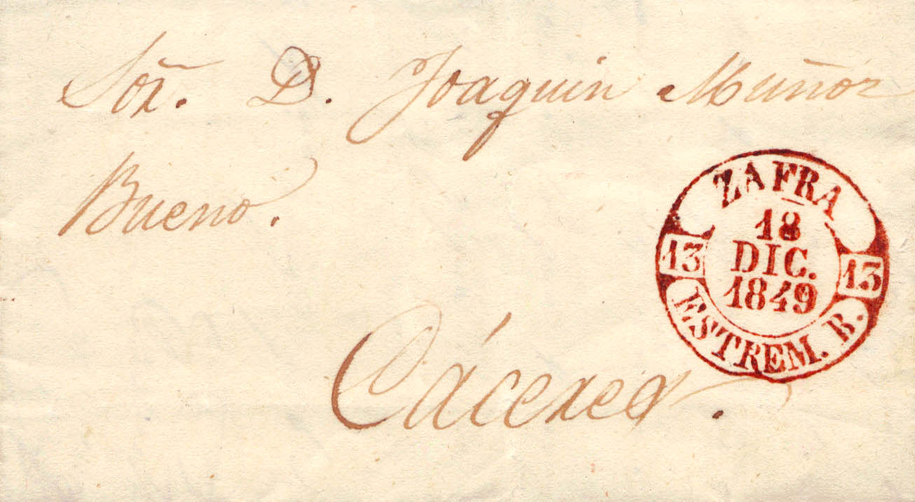 1849. VILLAGARCIA DE LA TORRE (BADAJOZ) a CACERES. Baeza ZAFRA / ESTREM.B., en rojo. MAGNIFICA ESTAMPACION.