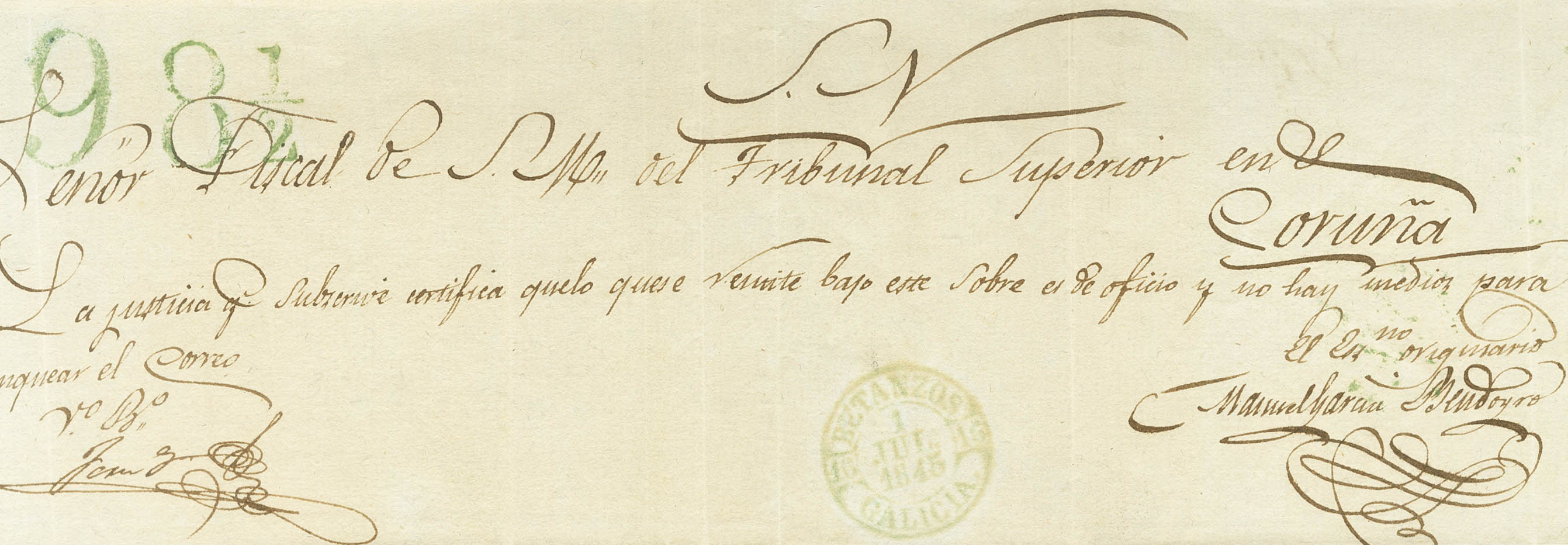 1845. Frente de Plica Judicial de BETANZOS a LA CORUÑA. Baeza BETANZOS / GALICIA, en verde. MAGNIFICA Y RARA.