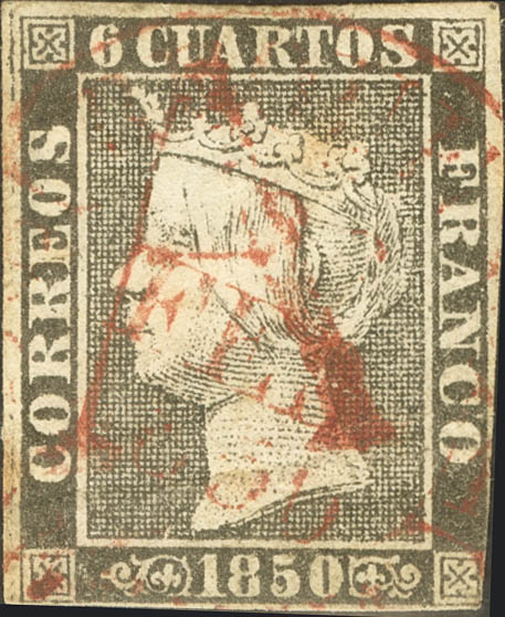 1. 1850. 6 cuartos negro. Matasello mixto "A", de abono de Requena y baeza, ambos en rojo. MAGNIFICO Y RARO. Cert. GRAUS.