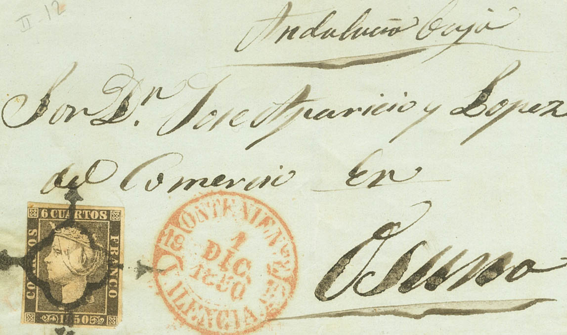 1A. 1850. 6 cuartos negro. ONTENIENTE a OSUNA (SEVILLA). En el frente baeza ONTENIENTE / VALENCIA. MAGNIFICA.