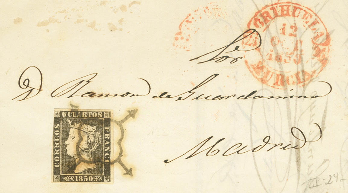 1A. 1850. 6 cuatro negro (II-24). ORIHUELA a MADRID. En el frente baeza ORIHUELA / MURCIA. MAGNIFICA ESTAMPACION.