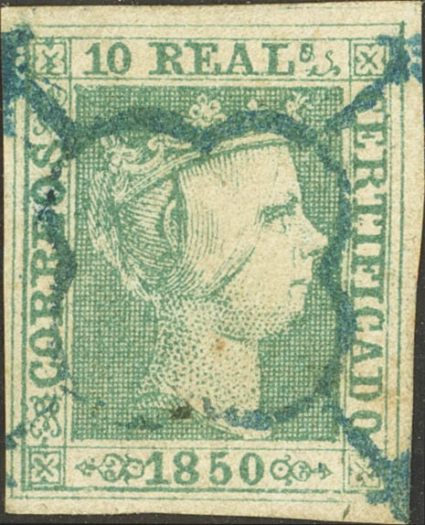 5. 1850. 10 reales verde (reparado). Matasello ARAÑA, en azul. MAGNIFICO Y MUY RARO, PIEZA DE ENORME ESPECTACULARIDAD. Cert. CEM. Edifil 2020: 4.500 Euros