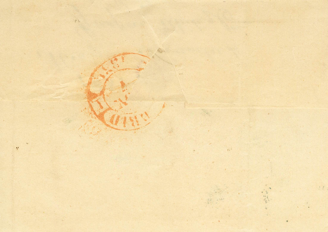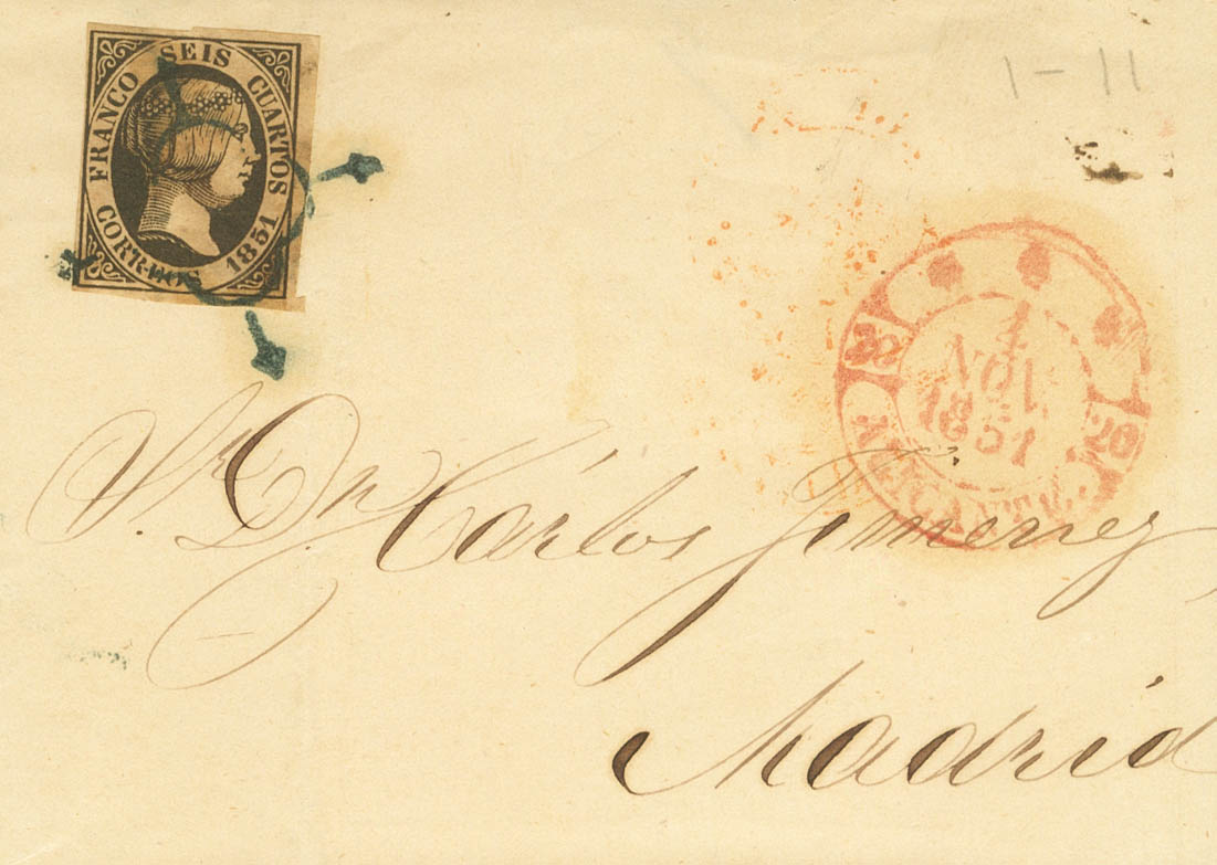 6. 1851. 6 cuartos negro. ALICANTE a MADRID. Matasello ARAÑA, en azul y en el frente baeza *** / ALICANTE, en rojo. MAGNIFICA Y RARA.