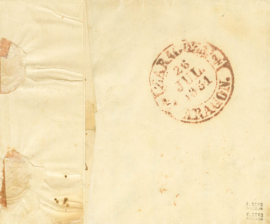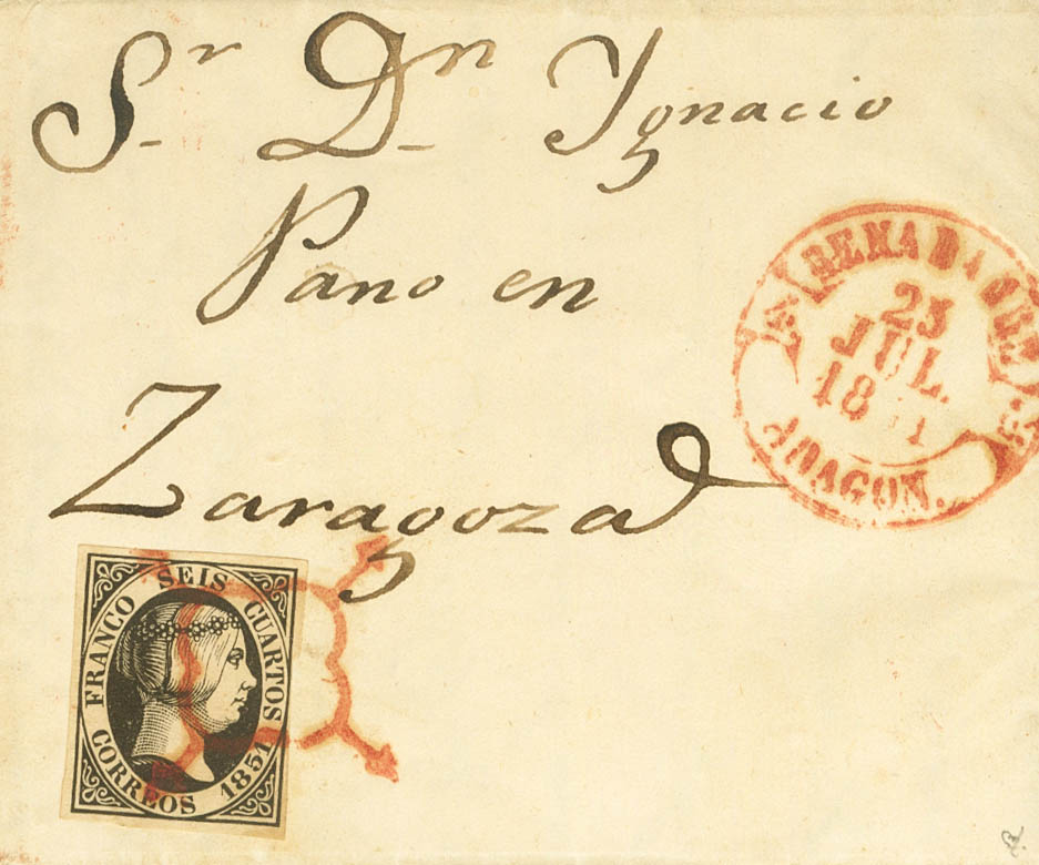 6. 1851. 6 cuartos negro. BENABARRE (HUESCA) a ZARAGOZA. Matasello ARAÑA, en rojo. MAGNIFICA Y MUY RARA, PIEZA DE ESPECTACULAR BELLEZA.