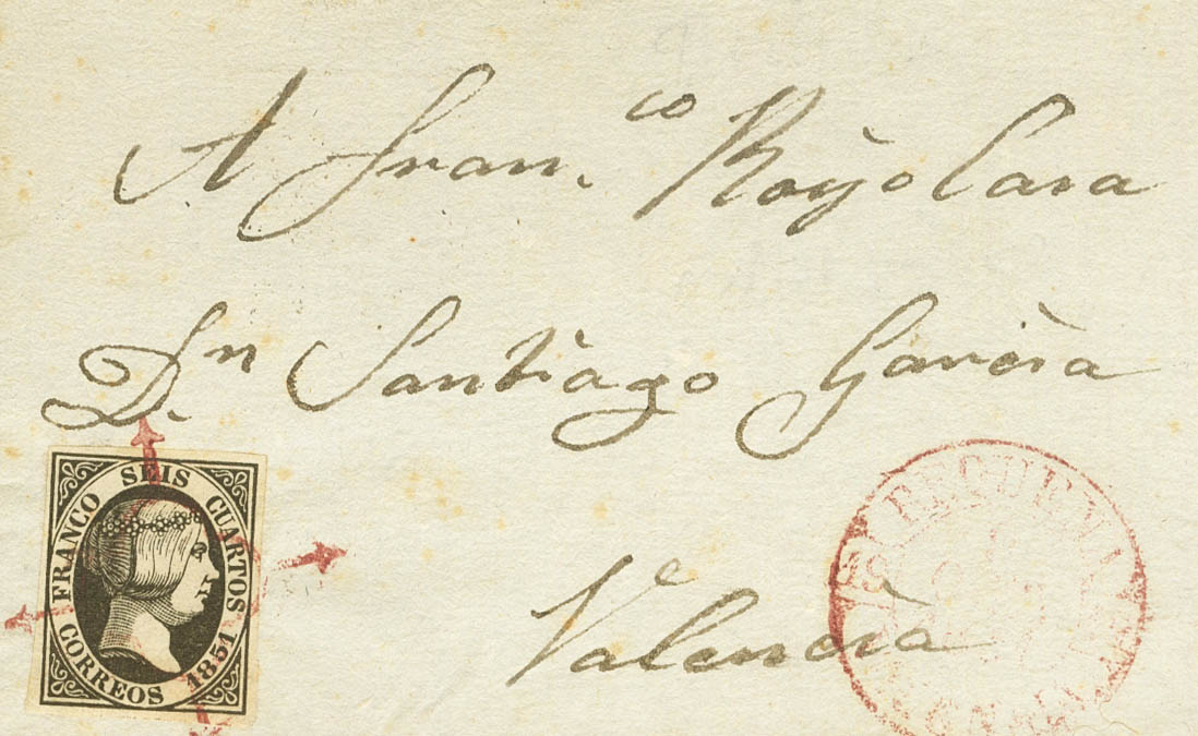 6. 1851. 6 cuartos negro. Frontal de REQUENA a VALENCIA. Matasello ARAÑA, en rojo. MAGNIFICO. Edifil 2020: 120 Euros