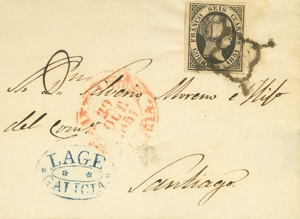 6. 1851. 6 cuartos negro. LAGE (CORUÑA) a SANTIAGO. Matasello ARAÑA y en el frente marca prefilatélica LAGE / GALICIA. MAGNIFICA Y EXTRAORDINARIAMENTE RARA.