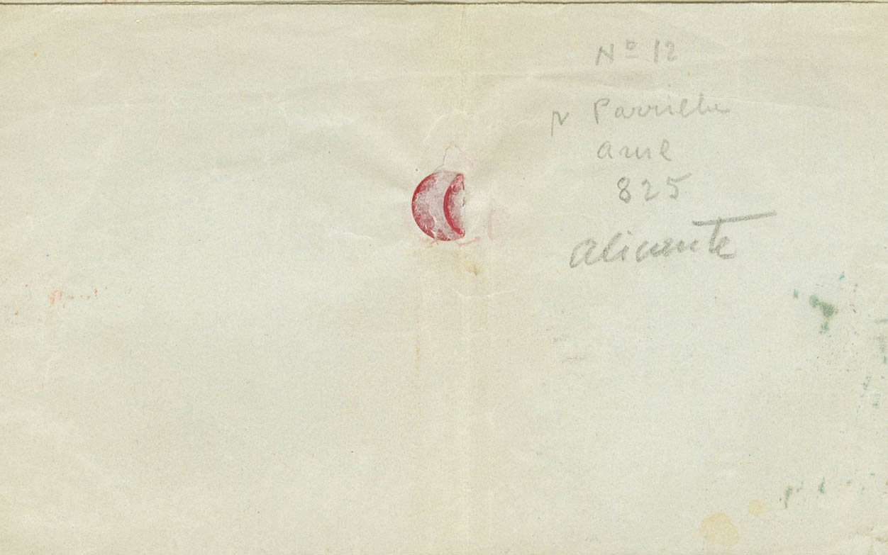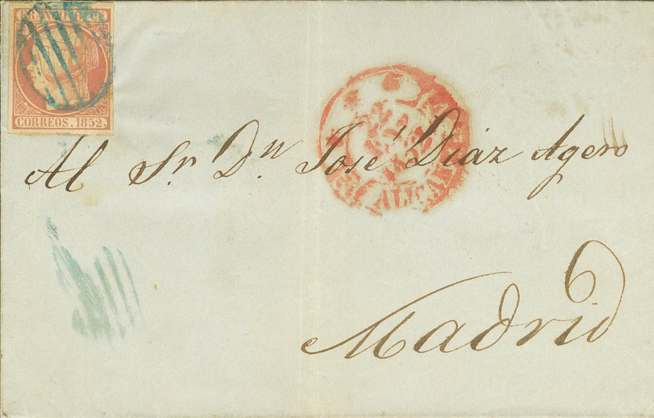 12. 1852. 6 cuartos rosa. ALICANTE a MADRID. Matasello PARILLA, en azul. MAGNIFICA Y ESPECTACULAR.