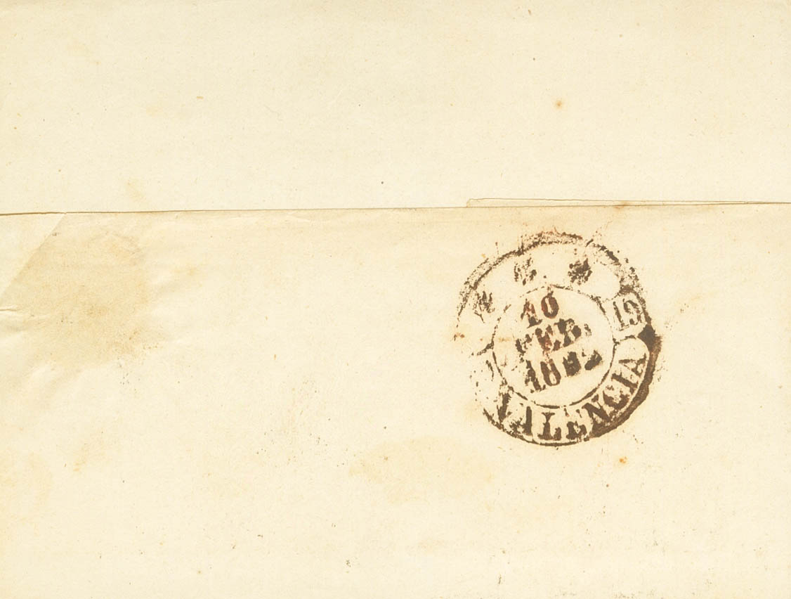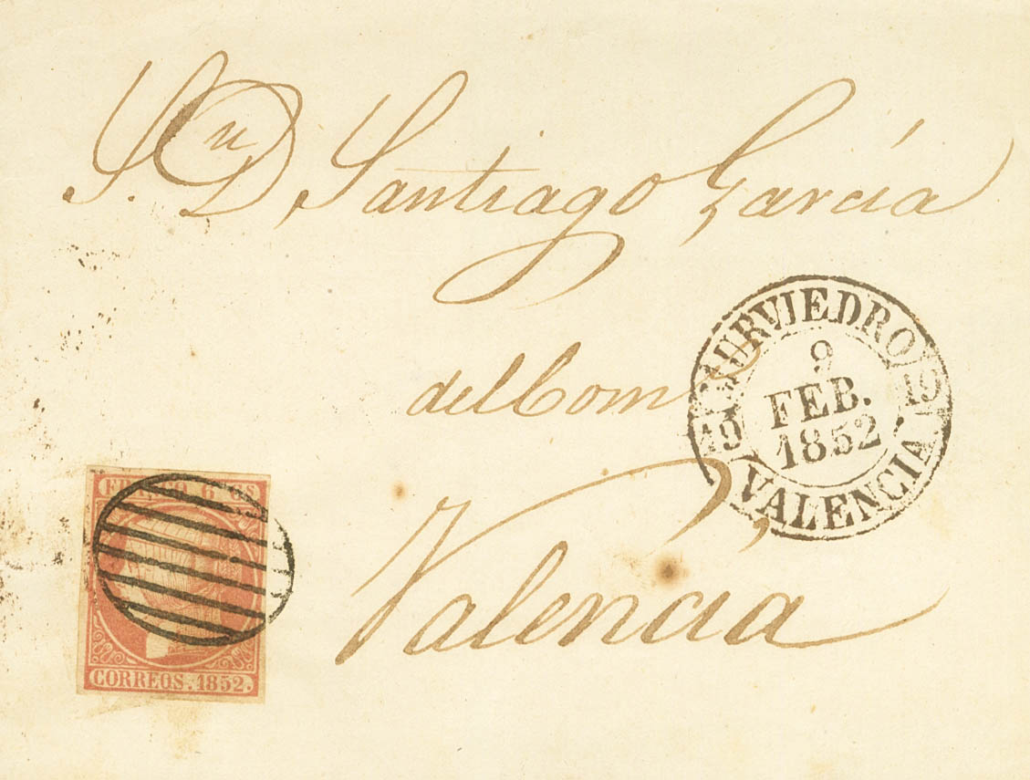 12. 1852. 6 cuartos rojo. MURVIEDRO a VALENCIA. En el frente baeza MURVIEDRO / VALENCIA, en rojo oxidado. MAGNIFICA ESTAMPACION.