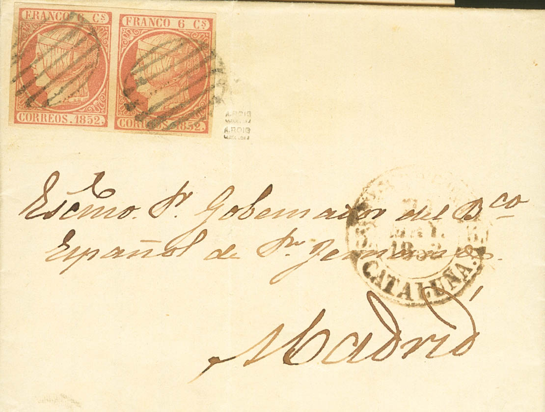 12(2). 1852. 6 cuartos rosa, pareja. TARRAGONA a MADRID. MAGNIFICA E INUSUAL FRANQUEO DE DOBLE PORTE.