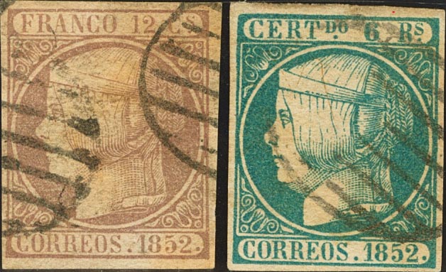 13, 16. 1852. 12 cuartos lila y 6 reales azul. MAGNIFICOS.
