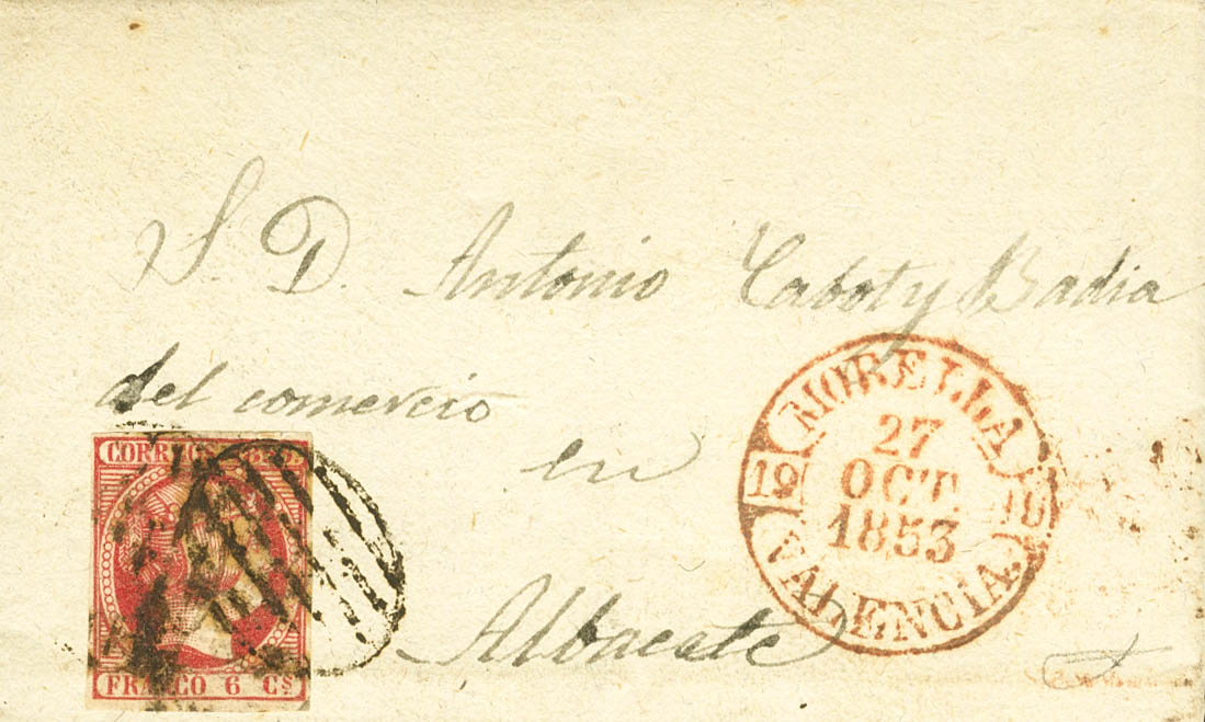 17. 1853. 6 cuartos rojo. CASTELLFORT (VALENCIA) a ALBACETE. En el frente baeza MORELLA / VALENCIA, en rojo. MAGNIFICA.