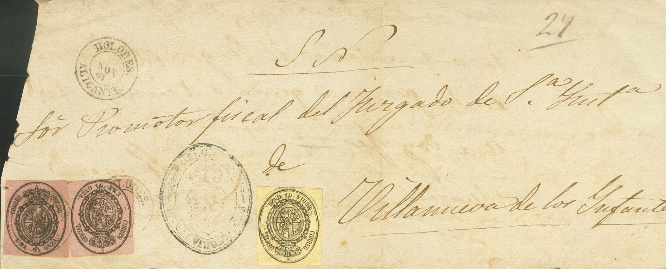 35, 36(2). 1864. ½ onza y 1 onza. Frente de Plica Judicial de DOLORES (ALICANTE) a VILLANUEVA DE LOS INFANTES (CIUDAD REAL). Matasello DOLORES / ALICANTE. MAGNIFICA.