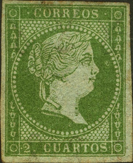 ★ 39. 1855. 2 cuartos verde (pequeñas manchas en el margen superior, sin importancia). Color intenso y grandes márgenes. MAGNIFICO. Cert. COMEX.