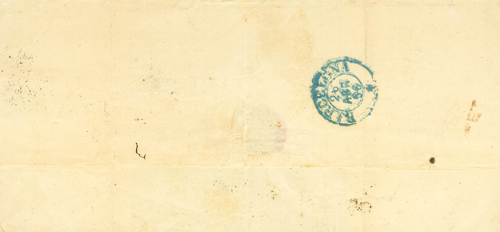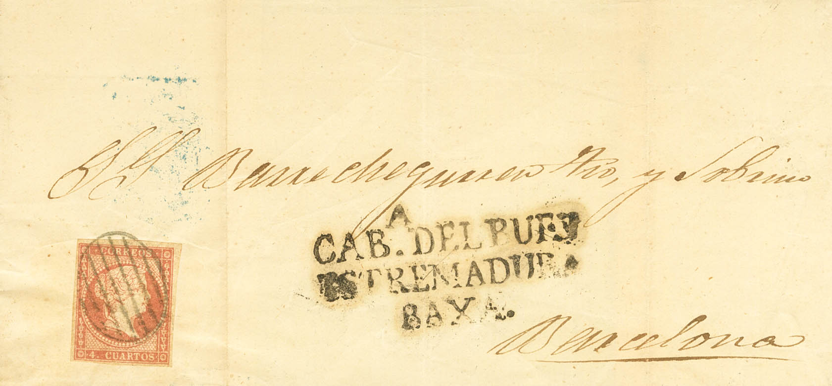 48. 1856. 4 cuartos rojo. CABEZA DE BUEY (BADAJOZ) a BARCELONA. En el frente marca prefilatélica CABª DEL BUEY / ESTREMADURA / BAXA. MAGNIFICA.