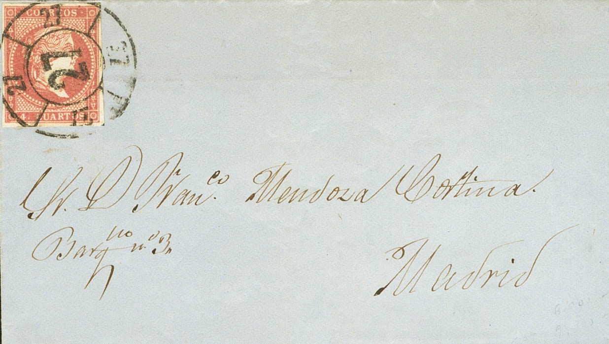 48. (1855ca). 4 cuartos rojo. GUADALAJARA a MADRID. Matasello R.CARRETA Nº27, de Guadalajara. MAGNIFICA ESTAMPACION.