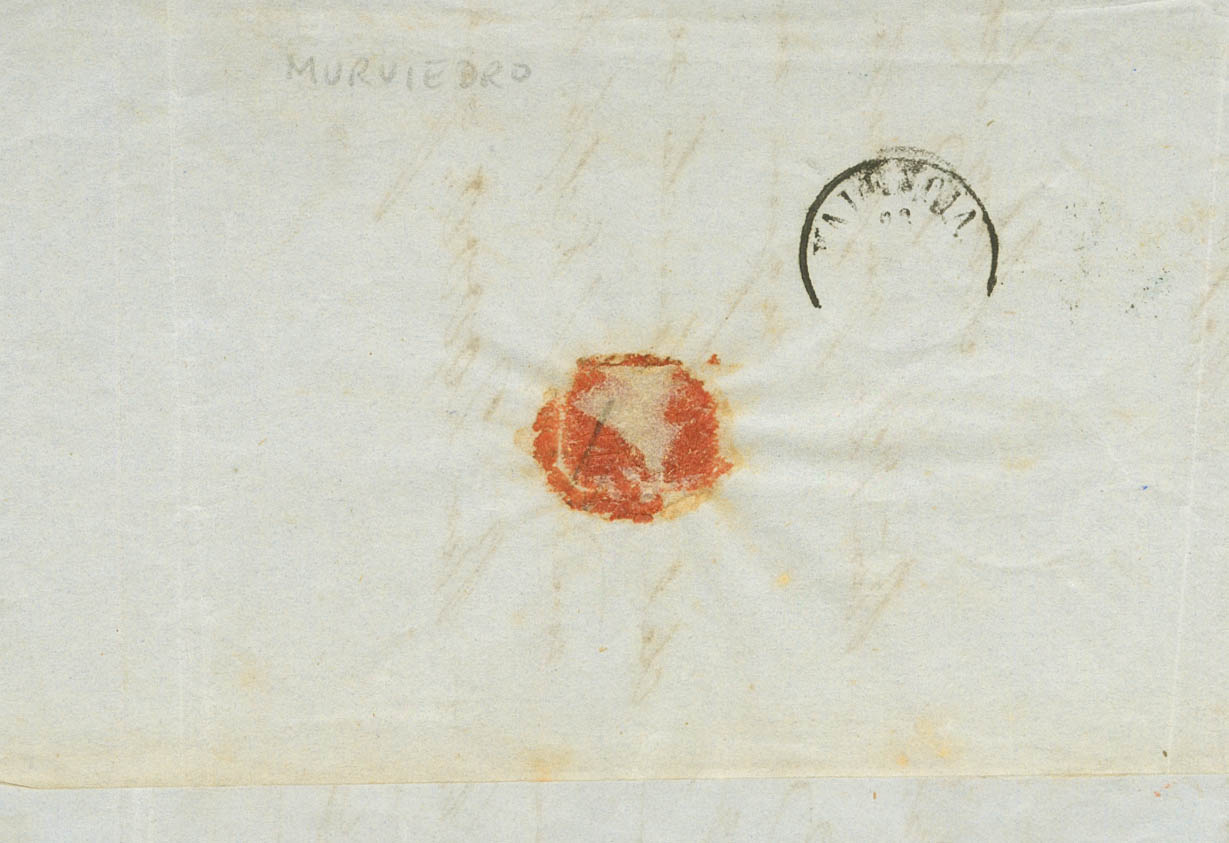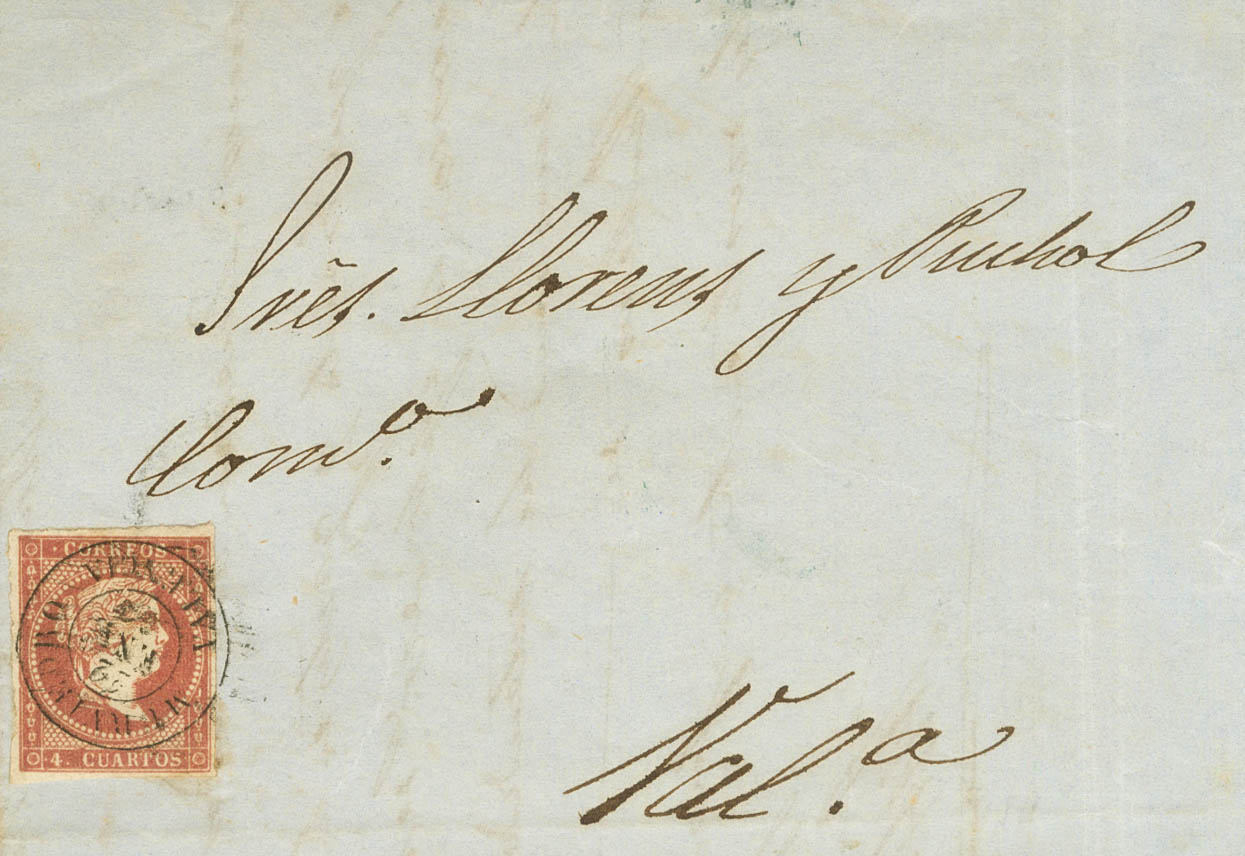 48. 1859. 4 cuartos rojo. MURVIEDRO a VALENCIA. Matasello MURVIEDRO / VALENCIA. MAGNIFICA.