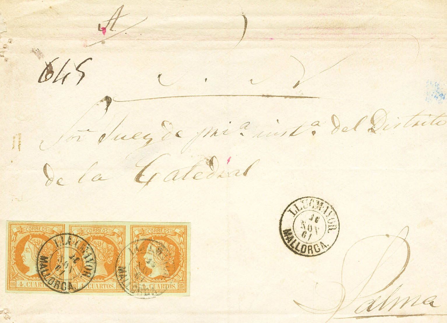 52(3). 1861. 4 cuartos naranja, tira de tres. LLUCHMAYOR a PALMA DE MALLORCA. Matasello LLUCHMAYOR / MALLORCA. MAGNIFICA.