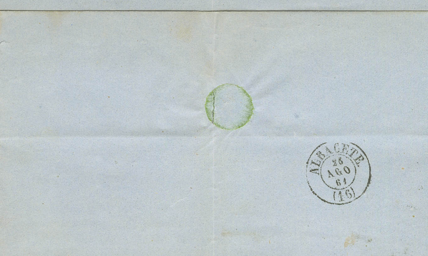 52F. 1861. 4 cuartos amarillo FALSO POSTAL TIPO I. VALENCIA a ALBACETE. Matasello R.CARRETA Nº8, de Valencia. MAGNIFICA Y RARA. Cert. COMEX.