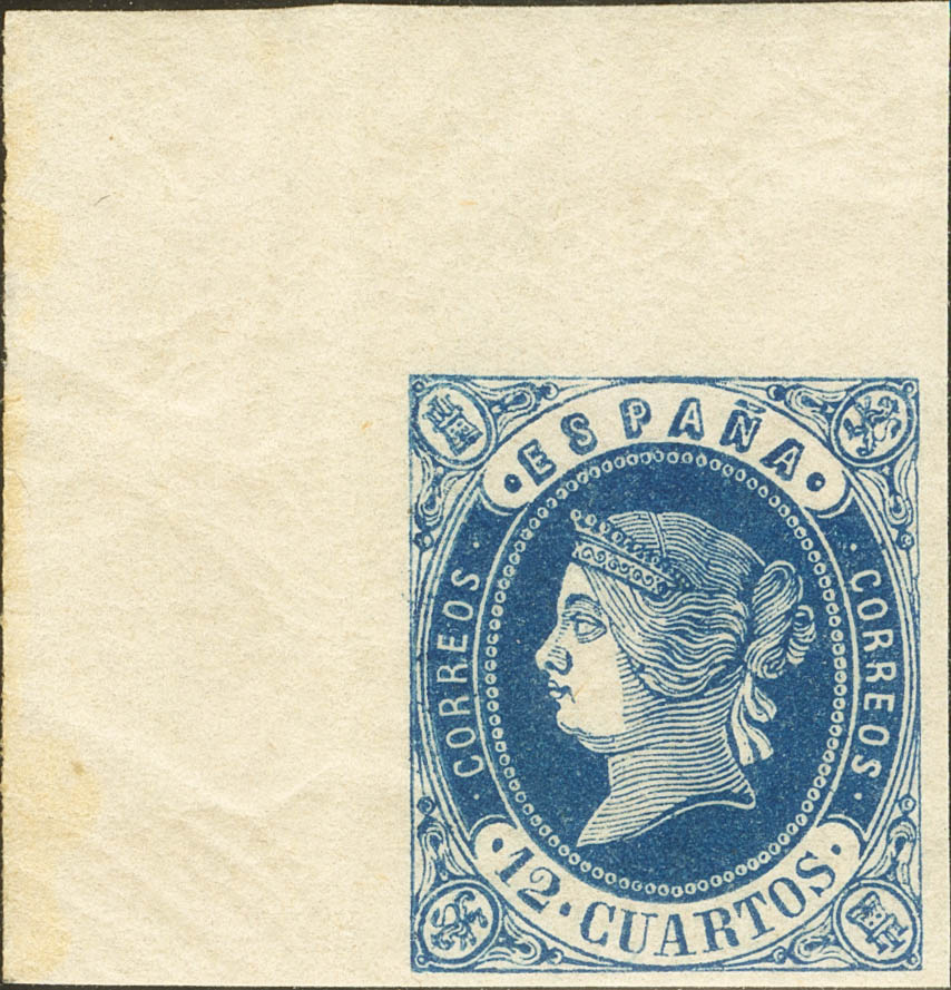 ★★ 59. 1862. 12 cuartos azul, esquina de pliego. Color intenso. PIEZA DE LUJO.