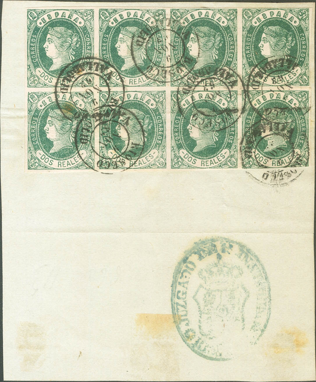 △ 62(8). 1862. 2 reales verde, bloque de ocho sobre fragmento. Matasello RIOSECO / VALLADOLID. MAGNIFICO.