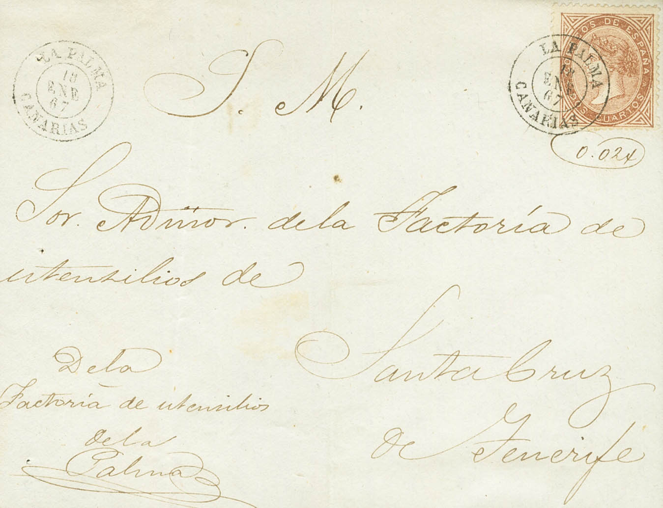 87. 1867. 2 cuartos castaño. Frontal de LA PALMA a SANTA CRUZ DE TENERIFE. Matasello LA PALMA / CANARIAS. MAGNIFICO.