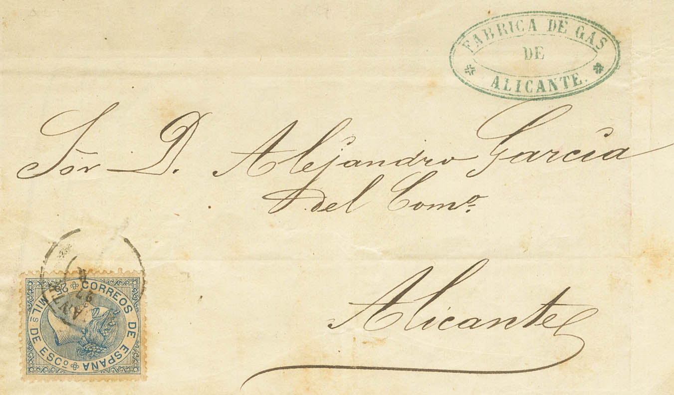 97. 1869. 25 mils azul. Correo Interior de ALICANTE. Matasello ALICANTE / (9). MAGNIFICA.