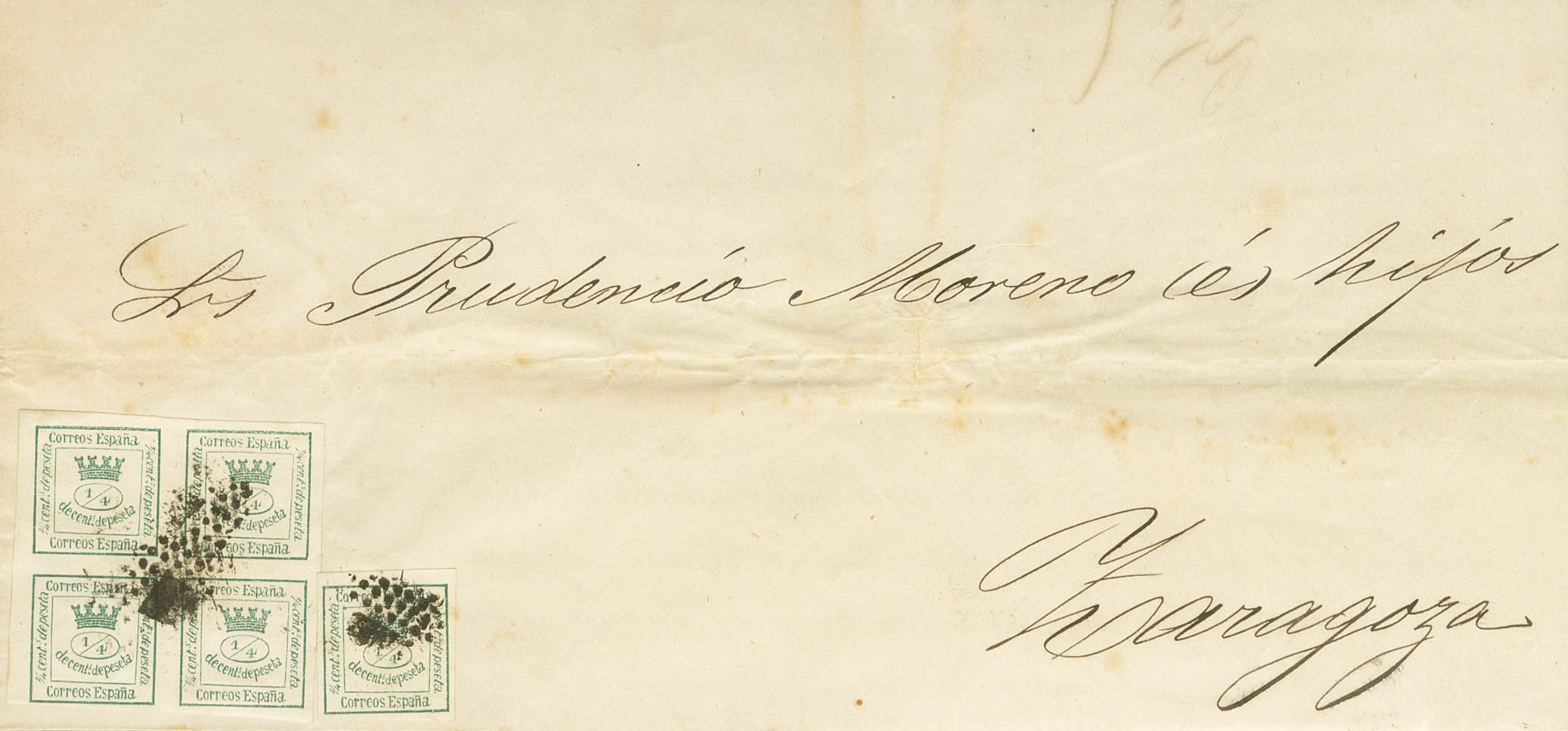 130. 1873. (1 de Julio). 1/4 cts verde, cinco sellos. Correo Interior de ZARAGOZA. Tarifa de Impresos. MAGNIFICA Y RARISIMO PRIMER DIA DE CIRCULACION DE LA EMISION.