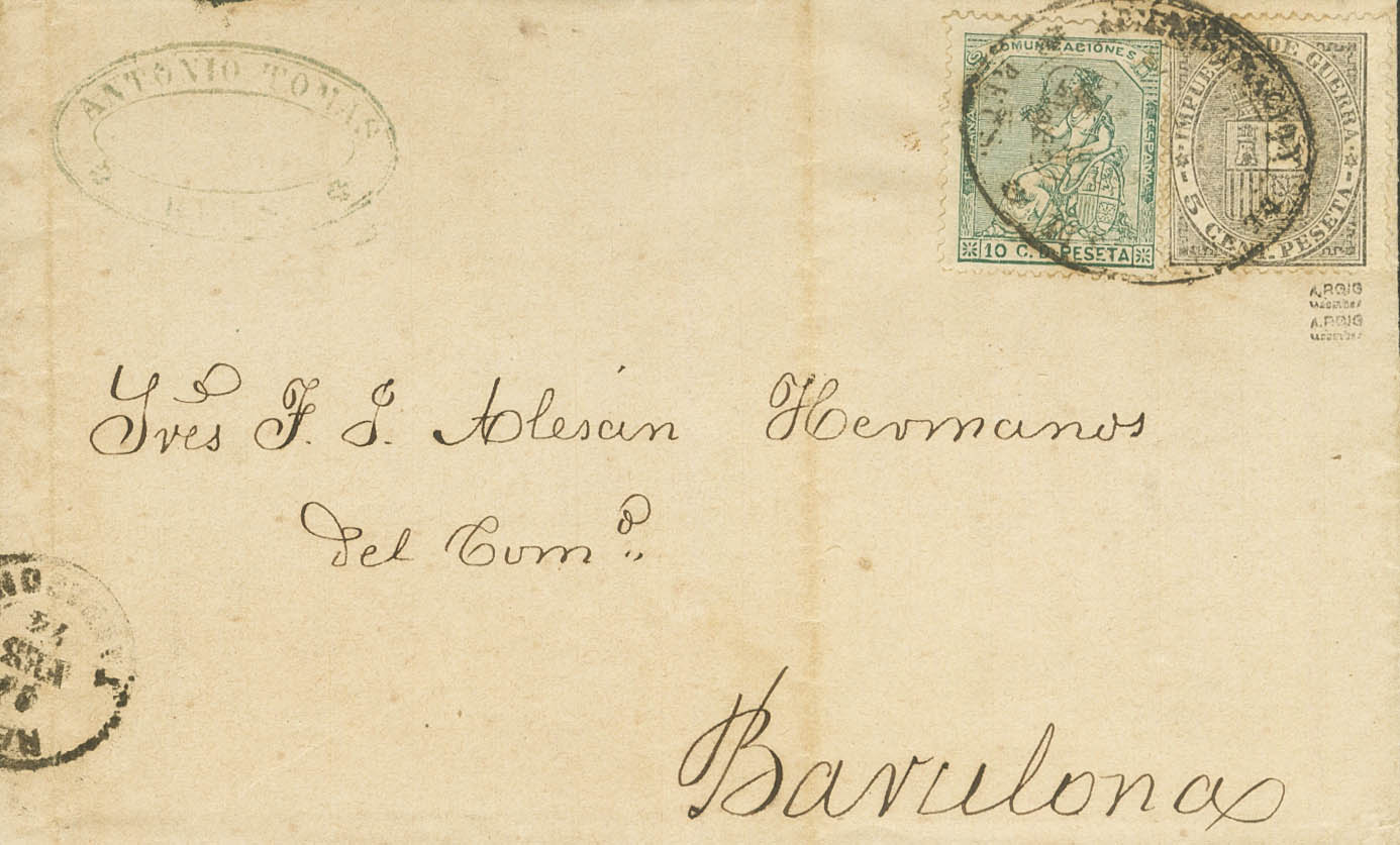 133, 141. 1874. 10 cts verde y 5 cts negro de Impuesto de Guerra. REUS a BARCELONA. Matasello ADMINISTRACION DE CORREOS / REUS (regular estampación). MAGNIFICA Y RARISIMA.