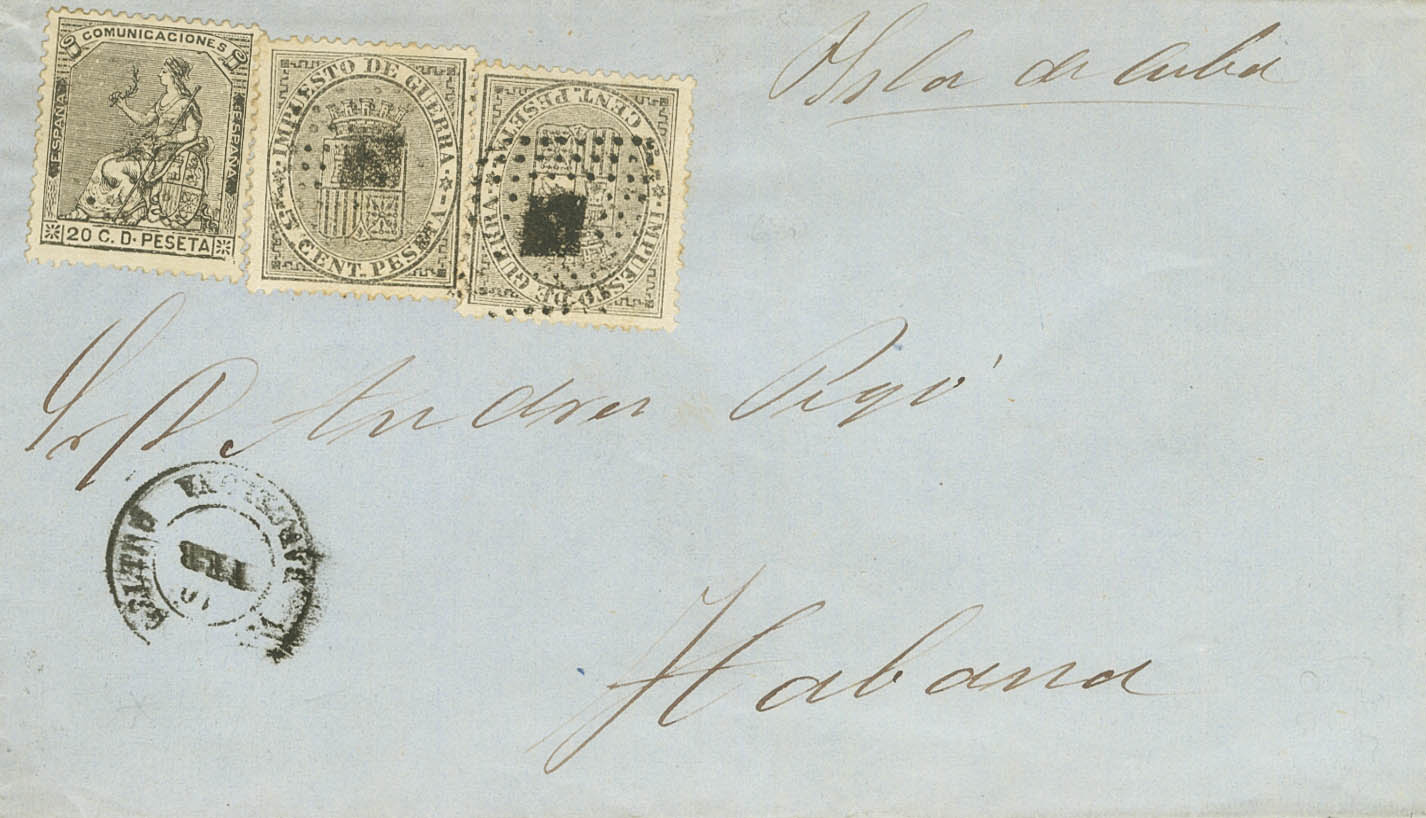 134, 141(2). (1874ca). 20 cts negro y 5 cts negro de Impuesto de Guerra, dos sellos. VILANOVA Y LA GELTRU a LA HABANA (CUBA). MAGNIFICA Y RARISIMA COMBINACION DE FRANQUEO, UTILIZANDO UN SELLO DE IMPUESTO DE GUERRA COMO ORDINARIO, PARA COMPLETAR LA TARIFA DE 25 CTS A CUBA, ESPECIALMENTE CON EL 20 CTS.