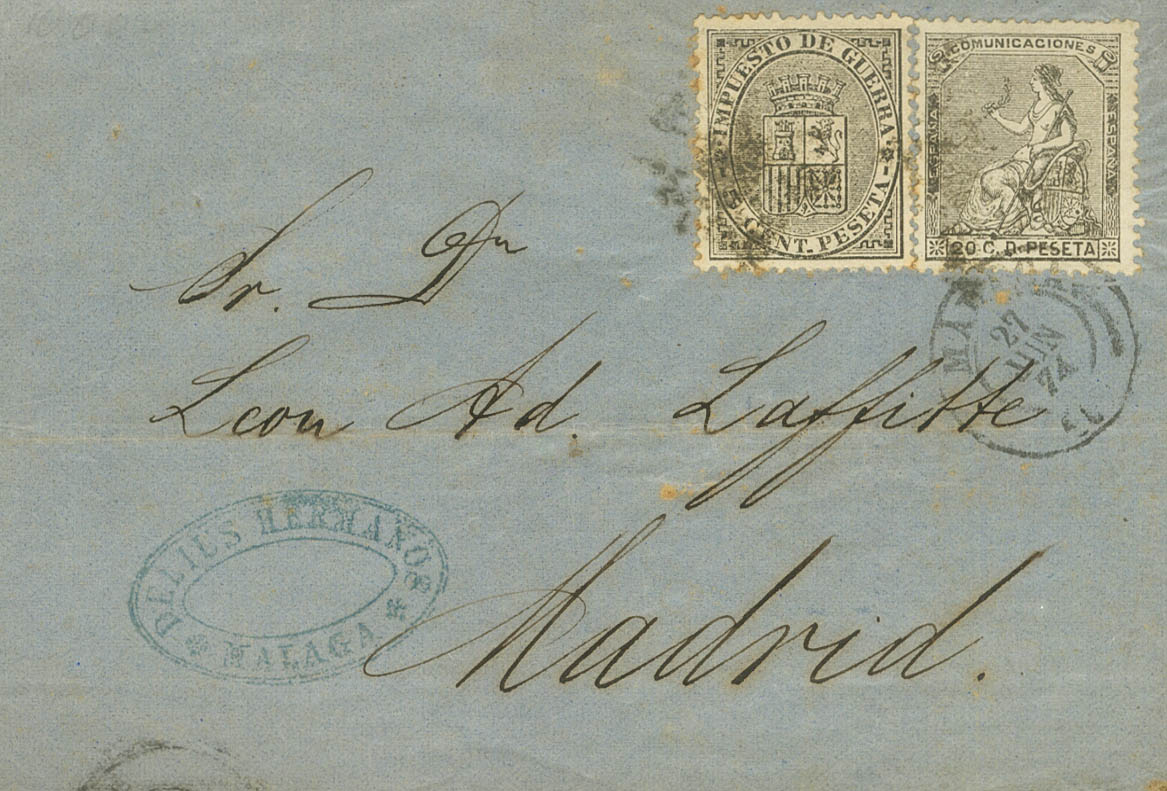 134, 141. 1874. 20 cts negro y 5 cts negro de Impuesto de Guerra. MALAGA a MADRID. MAGNIFICA Y RARO FRANQUEO DE DOBLE PORTE, ESPECIALMENTE CON EL 20 CTS NEGRO.