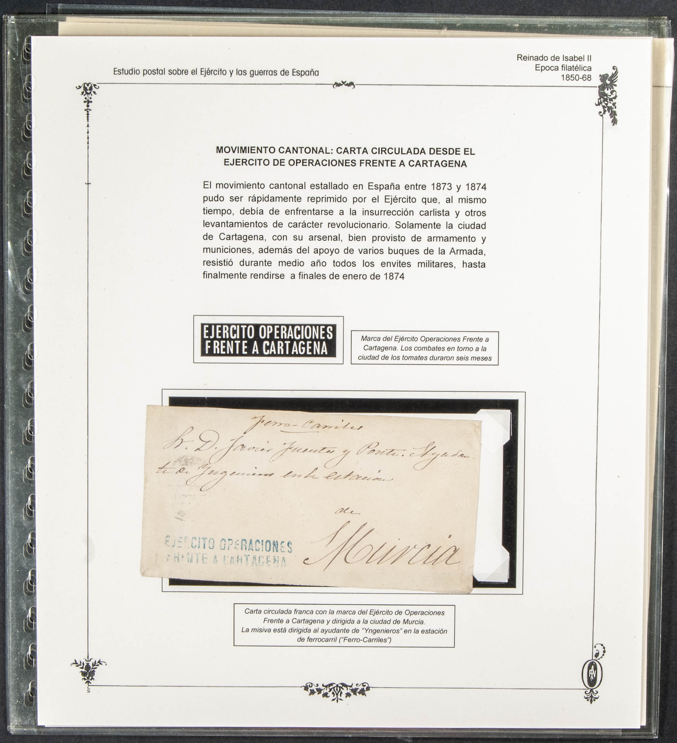 1873. Interesante colección relativa a la Revolución Cantonal o Rebelión Cantonal, insurrección que tuvo lugar durante la I República Española entre Julio de 1873 y Enero de 1874, incluye tres cartas circuladas durante este periodo, con textos interesantes acerca de la insurrección, una sin marcas especiales, de Sevilla a Cádiz, con texto interior acerca de la toma de posiciones y colocación de artillería en diversos puntos, un frontal de Baena a Sevilla con marca COMANDANCIA MILITAR / DEL CANTON / EN BAENA, un frontal de Cartagena a Murcia con marca EJERCITO OPERACIONES / FRENTE A CARTAGENA, en azul y un despacho telegráfico con texto acerca de los insurrectos del Cantón. MAGNIFICO Y RARISIMO CONJUNTO.