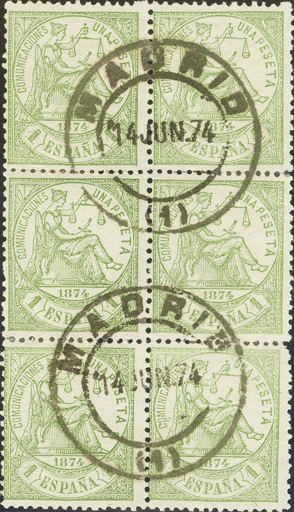 150. 1874. 1 pts verde, bloque de seis. Matasello MADRID / (1). MAGNIFICO Y RARO.