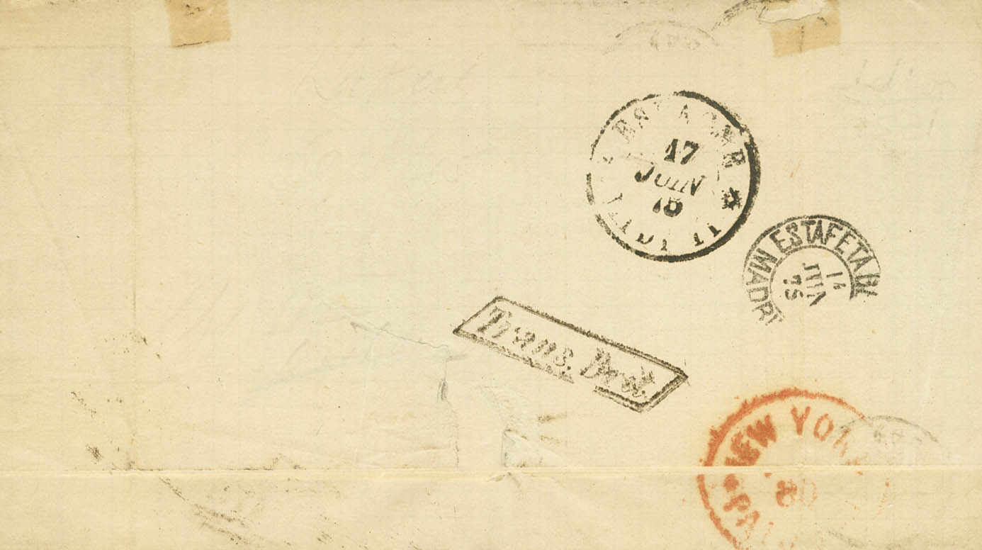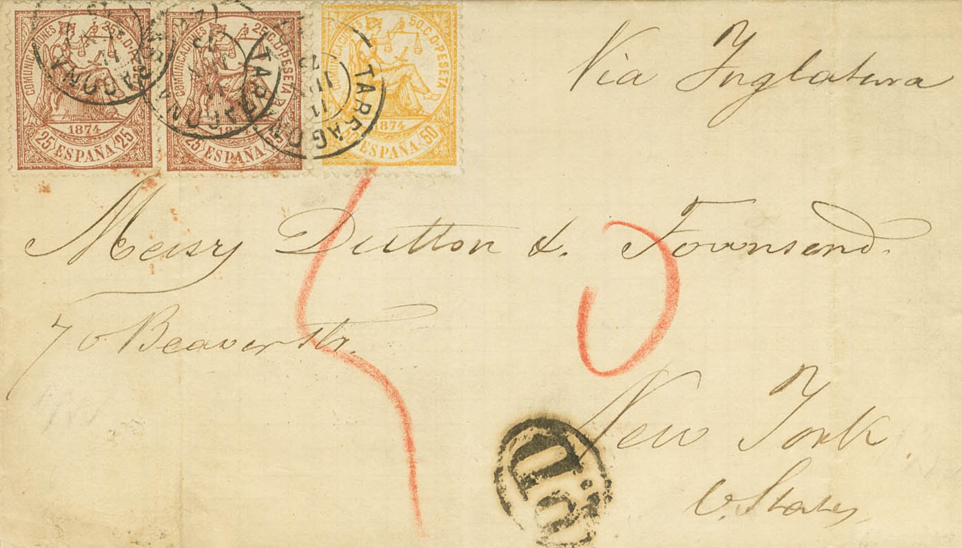 147(2), 149. 1875. 25 cts castaño, dos sellos y 50 cts amarillo. TARRAGONA a NUEVA YORK (U.S.A.), preparada para circular vía Inglaterra con la tarifa de 1 pts (Octubre de 1870) pero circulada por Inglaterra vía Bélgica con exceso de 20 cts según tarifa de Noviembre de 1871. Matasello TARRAGONA / (46) y al dorso fechador belga, marca TRANS.BRIT. en cursiva y llegada. MAGNIFICA Y MUY RARA COMBINACION DE FRANQUEO.