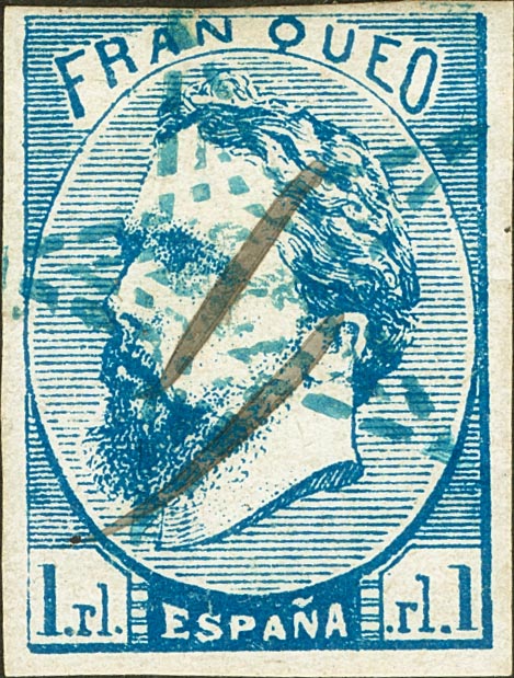 156. 1873. 1 real azul (puntito claro, sin importancia). Matasello ESTRELLA DE CINCO PUNTAS, en azul y numeral a pluma "11", de Zornoza. MAGNIFICO.