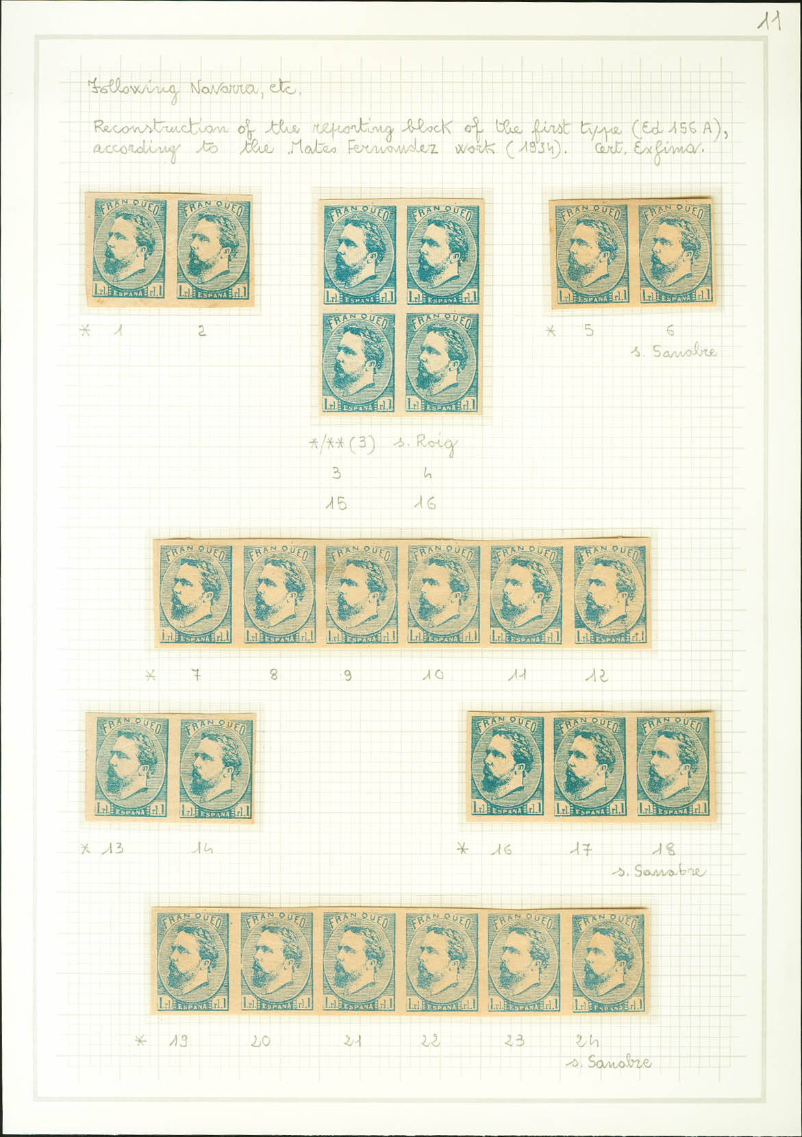 ★★/★ 156A(25). 1873. Reconstrucción completa de los 24 tipos del 1 real azul (sin tilde en la ñ) compuesto por un bloque de cuatro, dos tiras de seis (presenta un sello con punto claro en cada una de las tiras), una tira de tres y tres parejas (una de ellas con una pequeña claridad)(la posición 16 repetida). MAGNIFICA Y ESPECTACULAR RECONSTRUCCION, DE ENORME CALIDAD. Cert. EXFIMA.