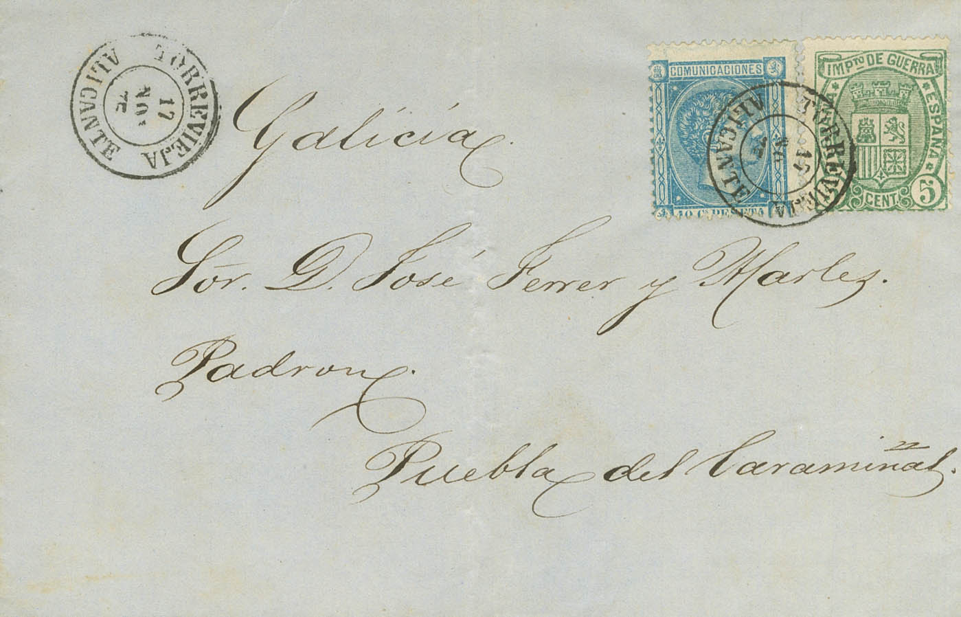 154, 164. 1875. 5 cts verde y 10 cts azul. TORREVIEJA a PUEBLA DEL CARAMIÑAL (CORUÑA). Matasello TORREVIEJA / ALICANTE. MAGNIFICA Y ESPECTACULAR.