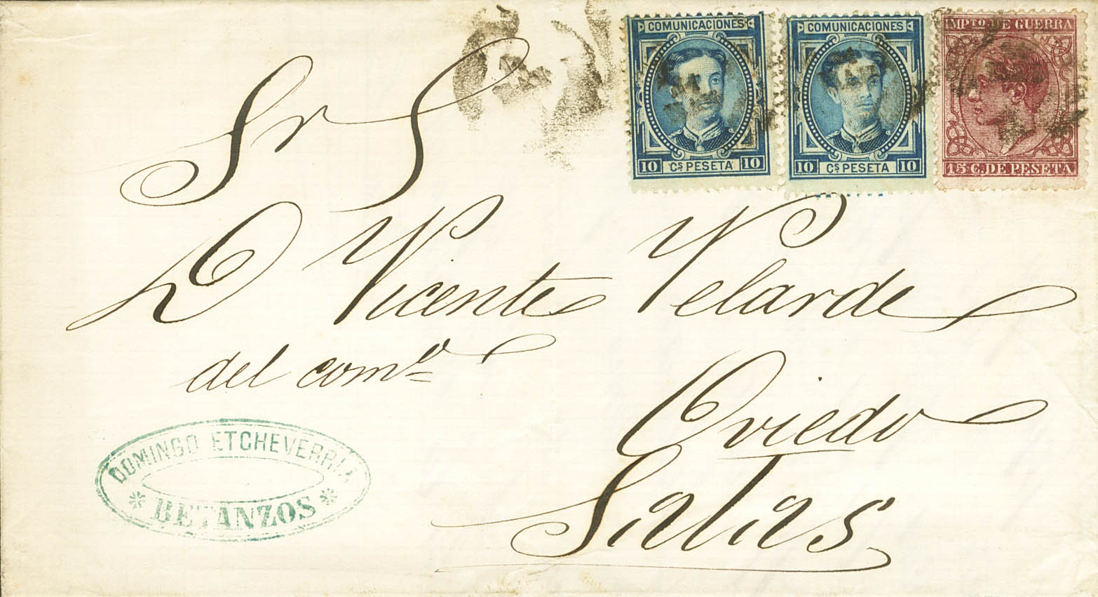 175(2), 188. 1878. 10 cts azul, dos sellos y 15 cts carmín. BETANZOS a SALAS (ASTURIAS). Franqueo de doble porte. MAGNIFICA.
