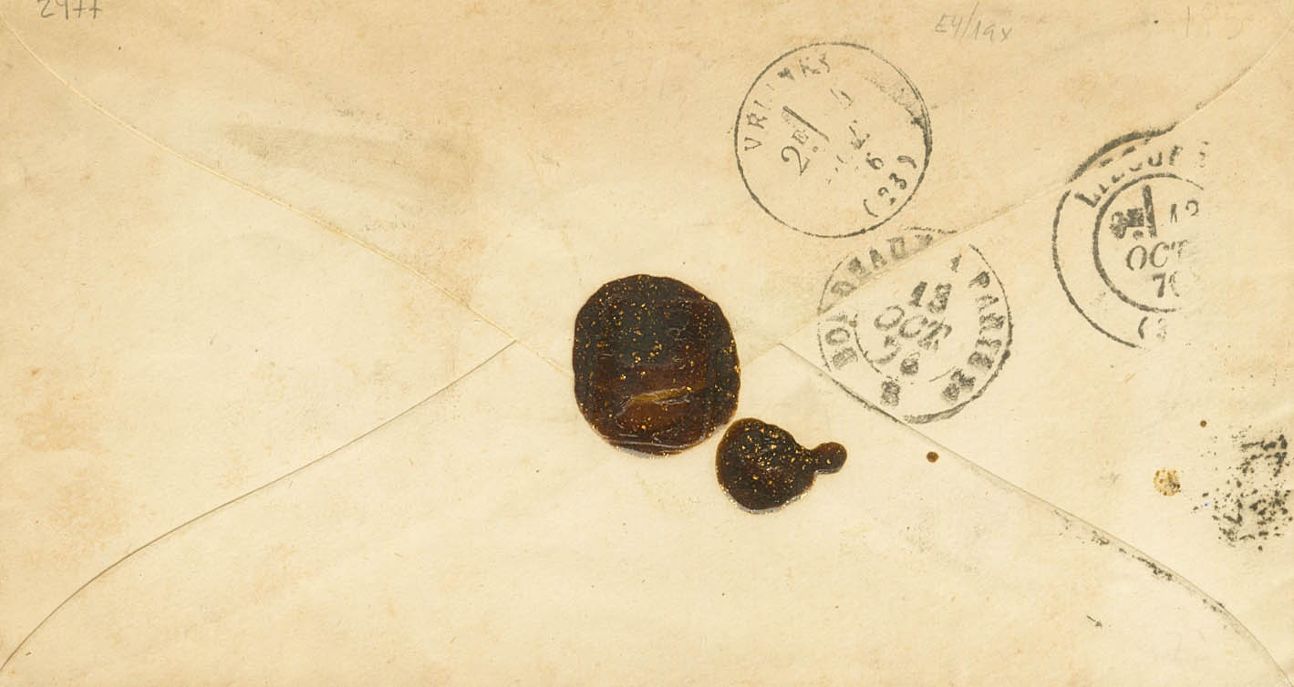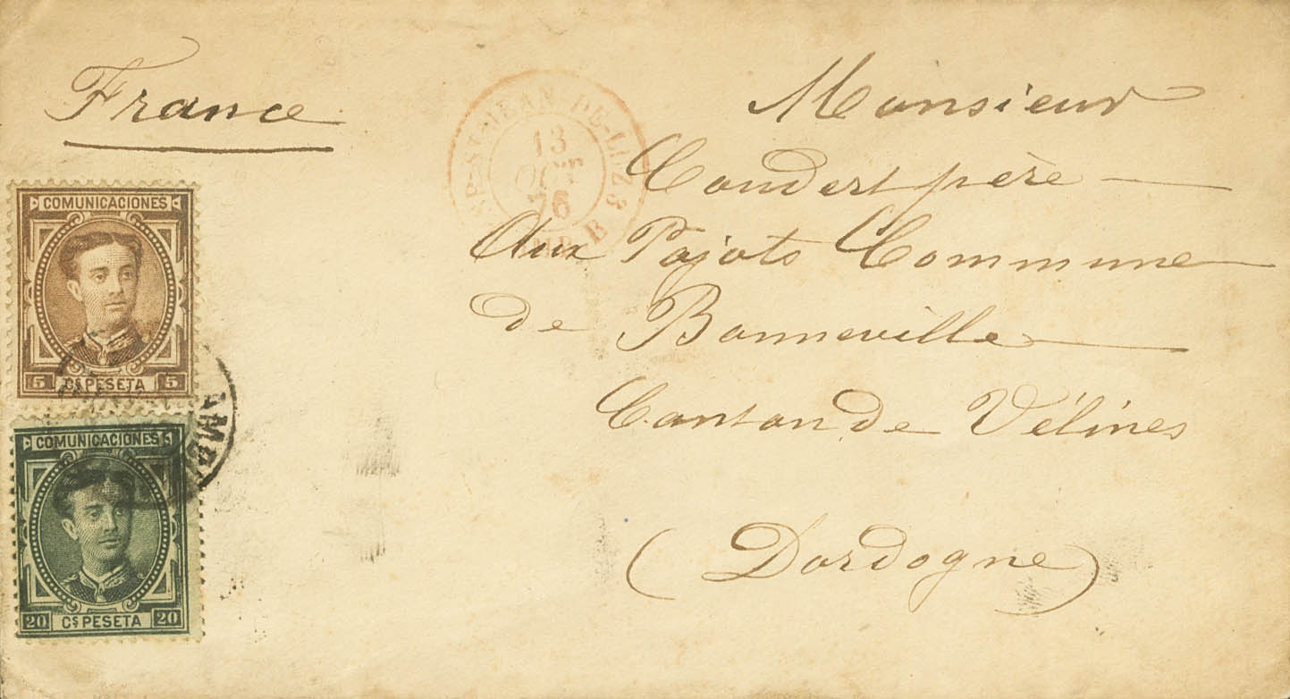 174, 176. 1876. 5 cts sepia y 20 cts verde bronce. Dirigida a BONNEVILLE (FRANCIA). Matasello AMBULANTE / NORTE, en negro. MAGNIFICA Y RARA.