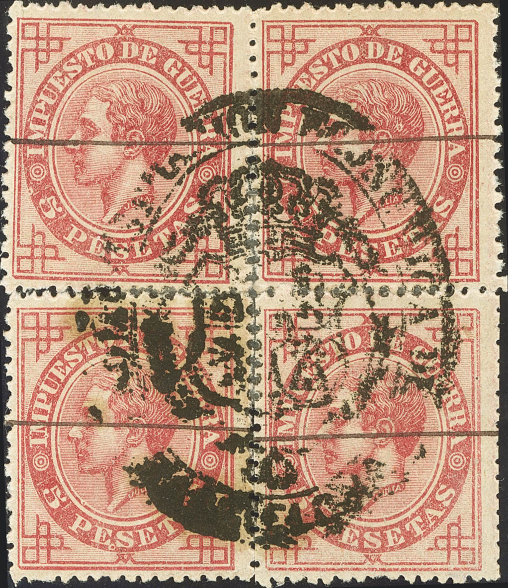 187(4). 1876. 5 pts rosa, bloque de cuatro (recompuesto a su estado original con fijasellos, el conjunto encaja perfectamente). Matasello judicial y trazos de pluma. MAGNIFICO Y RARISIMO BLOQUE.