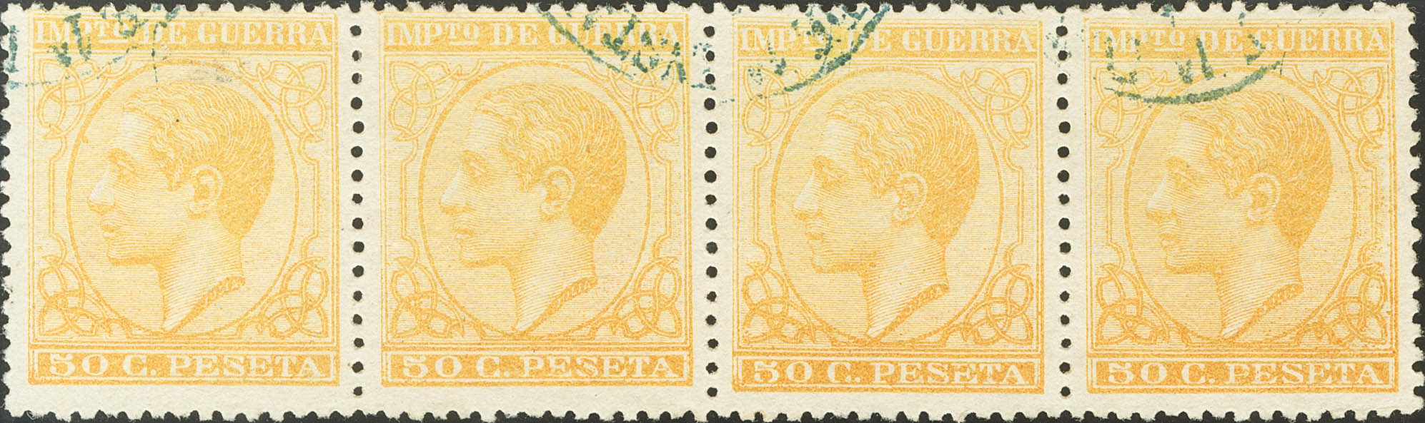 189(4). 1877. 50 cts amarillo, tira de cuatro (centraje excepcional, especialmente dos sellos). Matasello judicial, en azul. MAGNIFICA Y MUY RARO MULTIPLO.