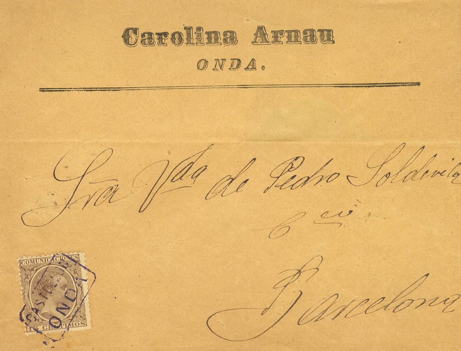 219. (1889ca). 15 cts castaño. ONDA a BARCELONA. Matasello cartería CASTELLON / ONDA. MAGNIFICA.