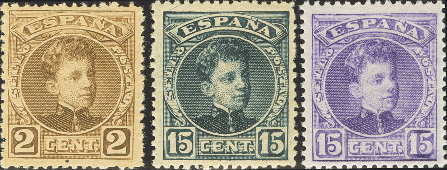 ★★ 241, 244, 246. 1901. 2 cts castaño, 15 cts negruzco y 15 cts violeta. Colores intensos. MAGNIFICOS.