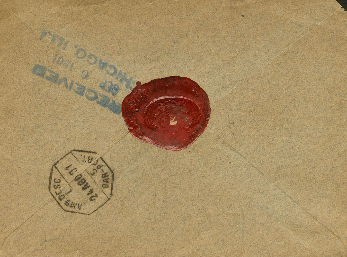 243(2), 244(2). 1901. 10 cts rojo, dos sellos y 15 cts azul negro, dos sellos. Certificado de GRANOLLERS a MINNESOTA (U.S.A.). Matasello tipo trébol GRANOLLERS / (BARCELONA) y en el frente tránsito REGISTERED / LONDON, en violeta y al dorso llegada. MAGNIFICA Y RARO USO TAN TARDIO DEL FECHADOR TIPO TREBOL.