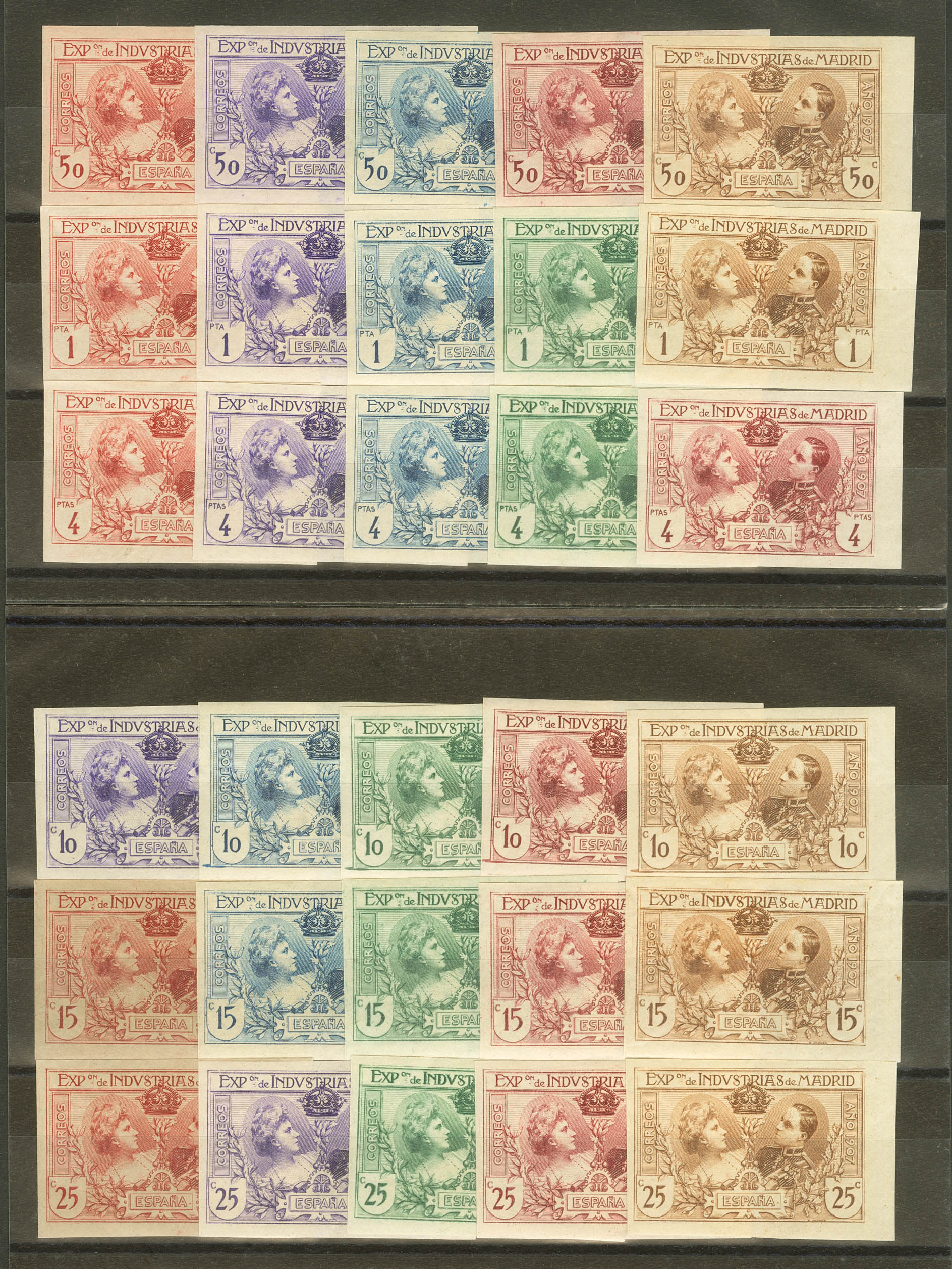 ★ SR1/6P(5). 1907. Juego completo de los treinta ENSAYOS DE COLOR y SIN DENTAR. MAGNIFICO Y RARO CONJUNTO. (Gálvez 1796/1825)