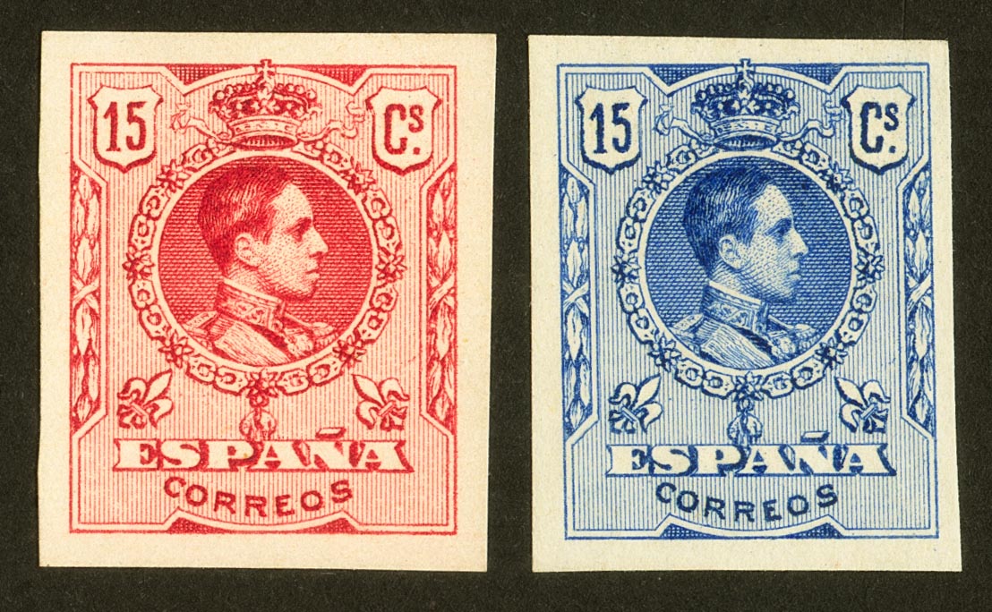 (★) 270P(2). 1909. 15 cts, en azul y rojo. PRUEBAS DE COLOR (sin dentar). MAGNIFICAS.